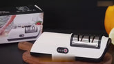 Electric Kitchen Knife Sharpener, Electric Kitchen Knife Sharpener on countertop, Electric Kitchen Knife Sharpener dual-stage slots, Electric Kitchen Knife Sharpener ergonomic handle, Electric Kitchen Knife Sharpener sharpening a chef knife, Electric Kitchen Knife Sharpener compact design